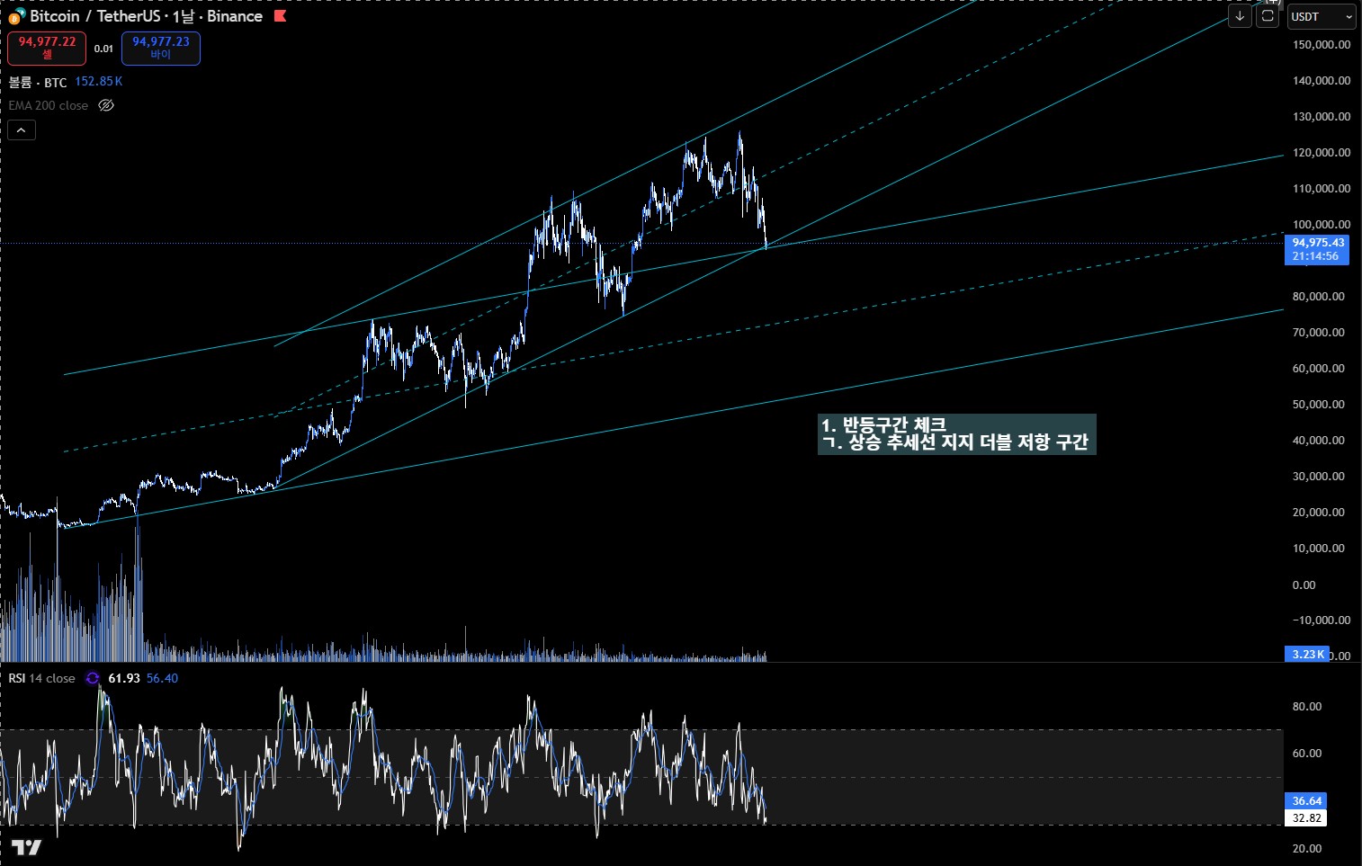 1. 상승 추세선 지지 + 더블 추세선 교차 구간