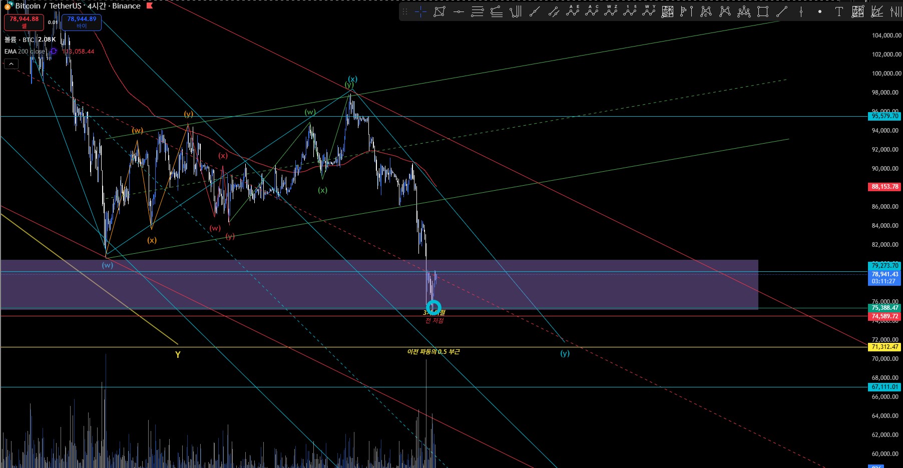 - 주요 지지선: 이전 파동의 0.5 부근인 71,312$ 라인을 최종 지지선으로 보고 있습니다.