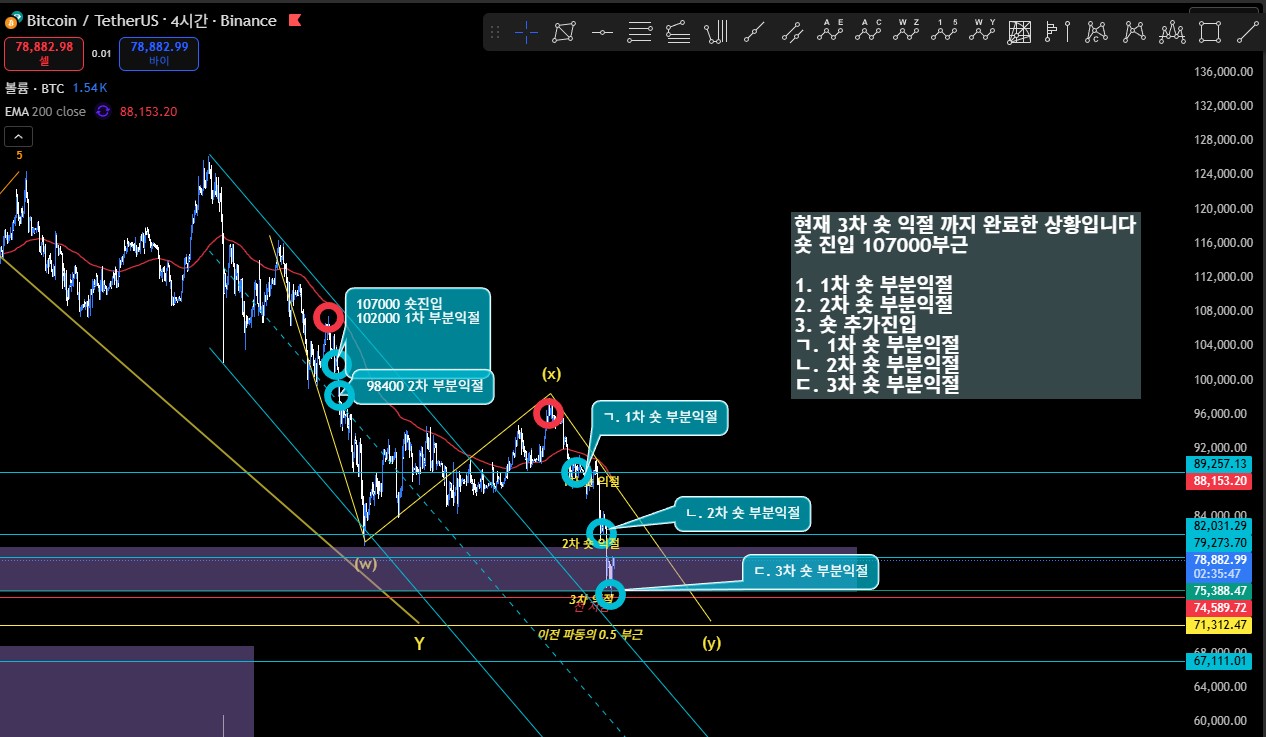 - 3차 익절: 75,388$ (30% 정리) - 이전 저점 부근의 강력한 반등 구간